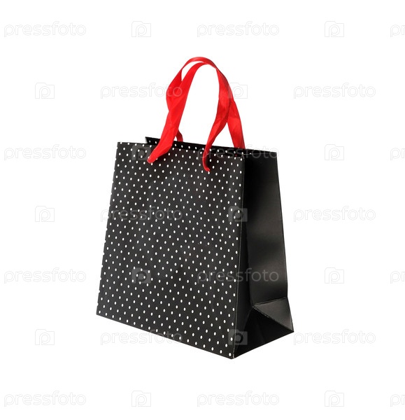 Черный бумажный пакет с красной ручкой, изолированной на белом фоне