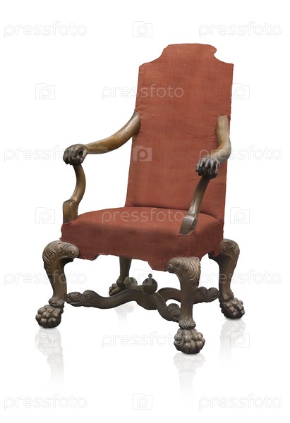 Древний деревянный стул, украшенный крытыми львами, изолирован на белом фоне