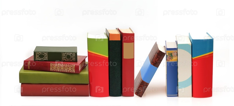 Куча книг в цветных обложках с белыми листами, изолированными на белом фоне