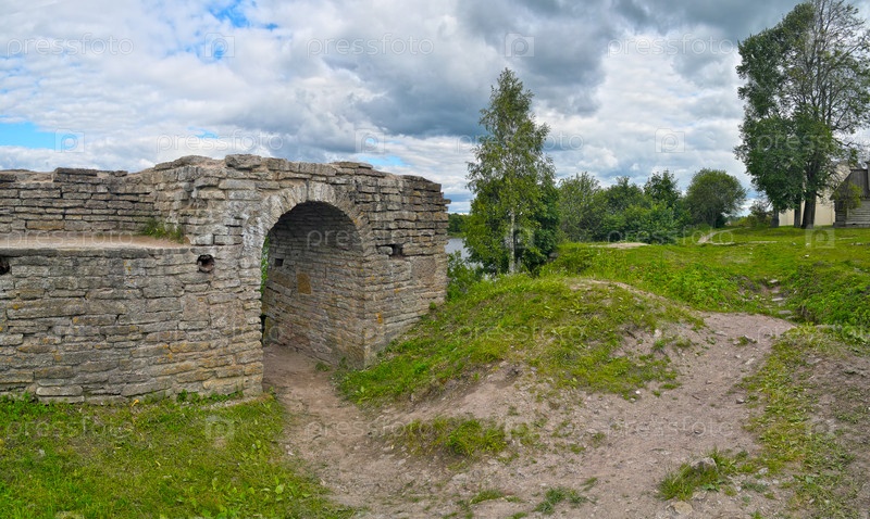 Древняя каменная арка Любшинской крепости в летнем пейзаже, Старая Ладога, Россия
