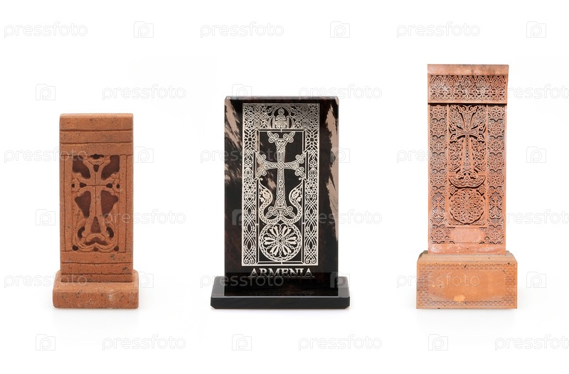 Каменный армянский крест (хачкар) изолирован на белом фоне