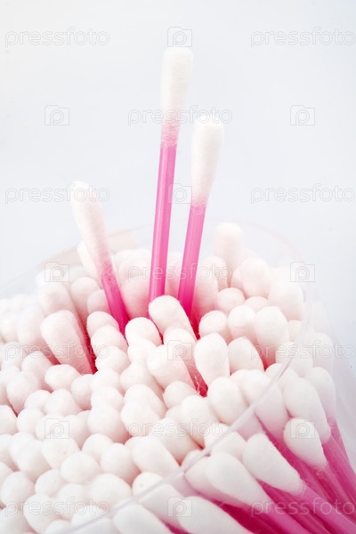Цветные хлопковые бутоны в пластиковом контейнере, изолированном на белом фоне