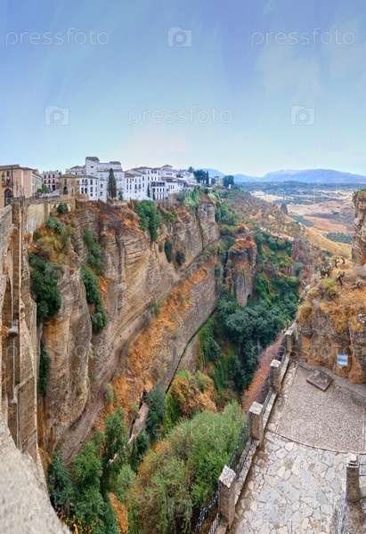 Панорамный летний вид на ущелье Тахо с террасы в Ронде