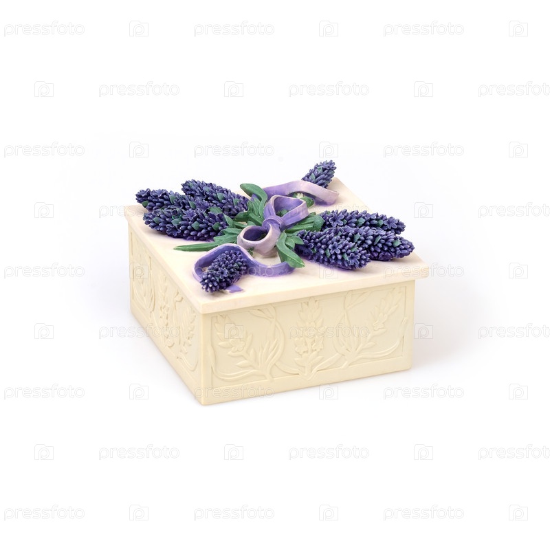 Керамическая коробка, украшенная цветущей лавандой, изолирована на белом фоне