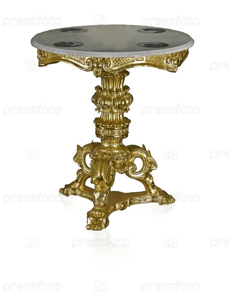 Круглый классический золотой стол на одной ноге изолирован от белого фона