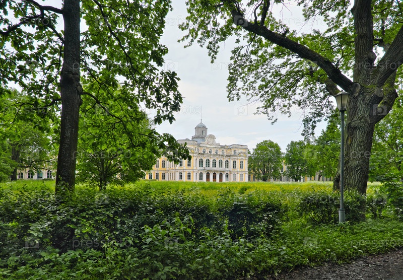 Знаменитое имение через дикие цветы и дождевые облака.Петродворец (Peterhof, Санкт-Петербург, Россия)