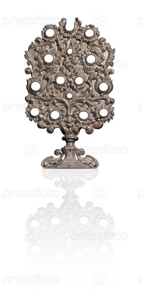 Серебряный декоративный элемент с цветочным узором выделен на белом фоне