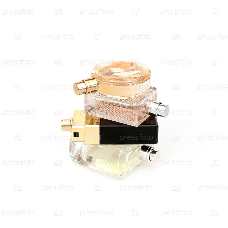 Куча бутылок с парфюмом, изолированных на белом фоне