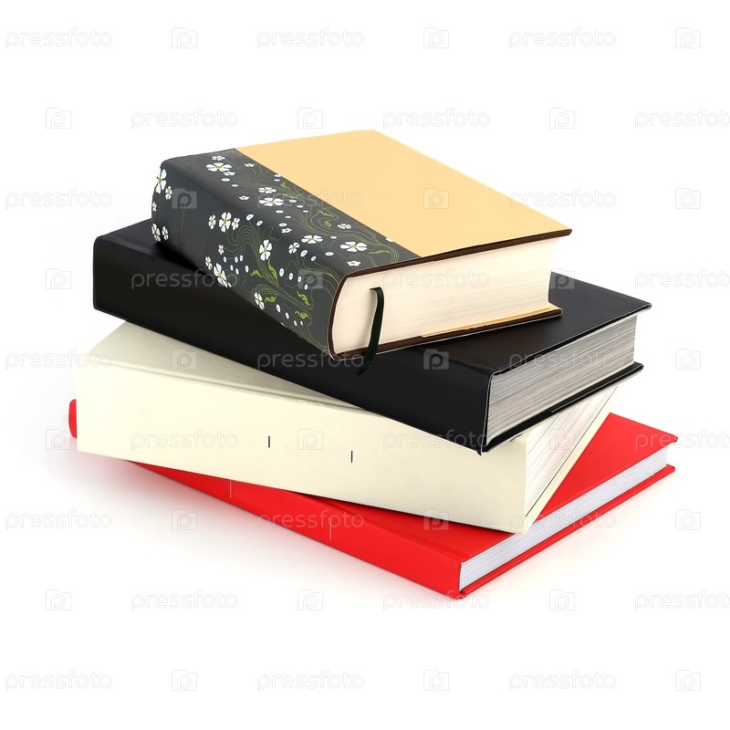 Куча книг в цветных обложках с белыми листами, изолированными на белом фоне