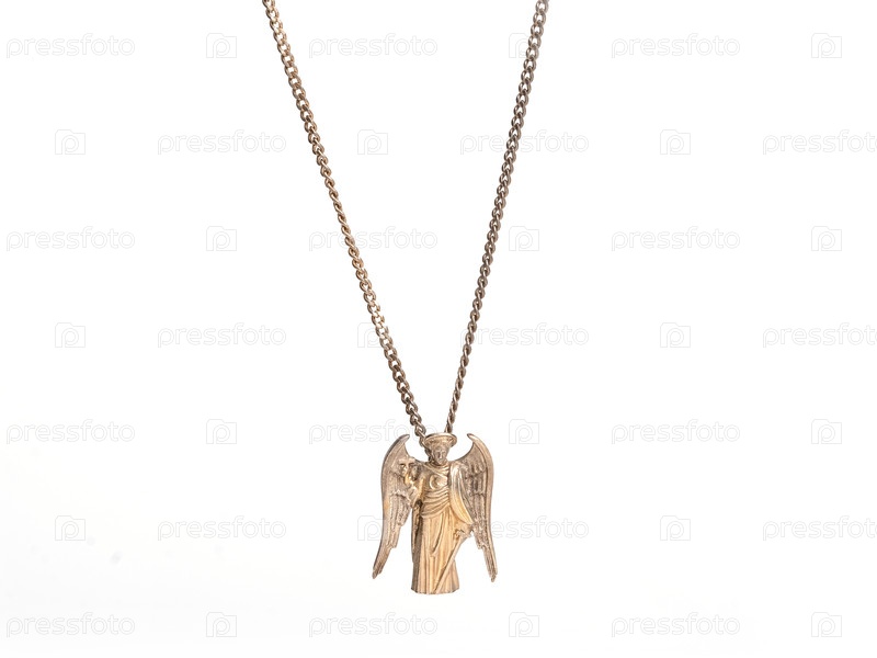 Золотой подвесок со статуей ангела, изолированной на белом фоне