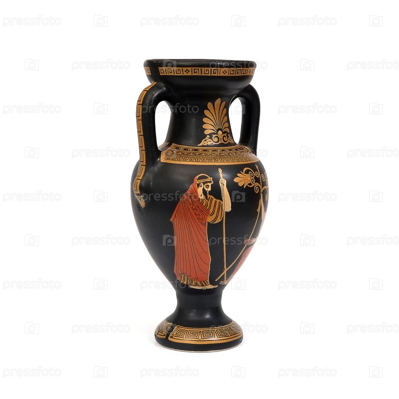 Сувенир из Греции в виде вазы выделен на белом фоне с мифологической фигурой