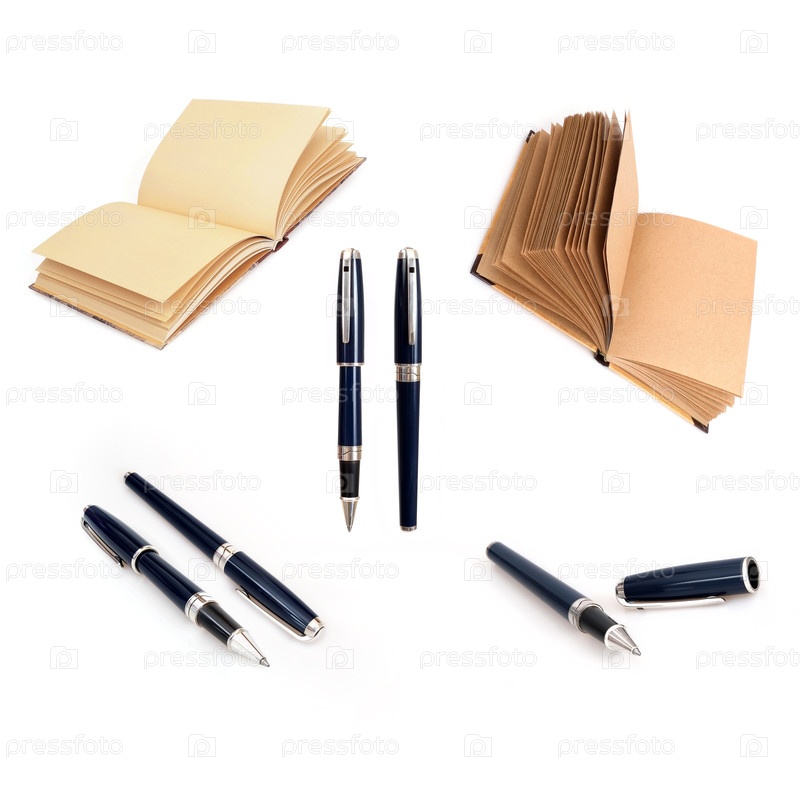Серебряные шариковые ручки и ноутбуки изолированы на белом фоне
