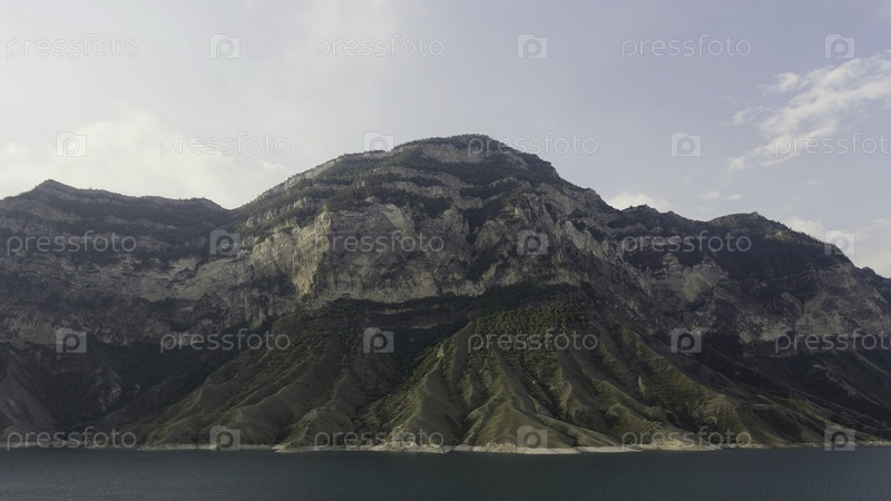 Вид с воздуха на огромные горы со растущими деревьями. Идите вперед. Летний холм и бирюзовая река на фоне облачного неба