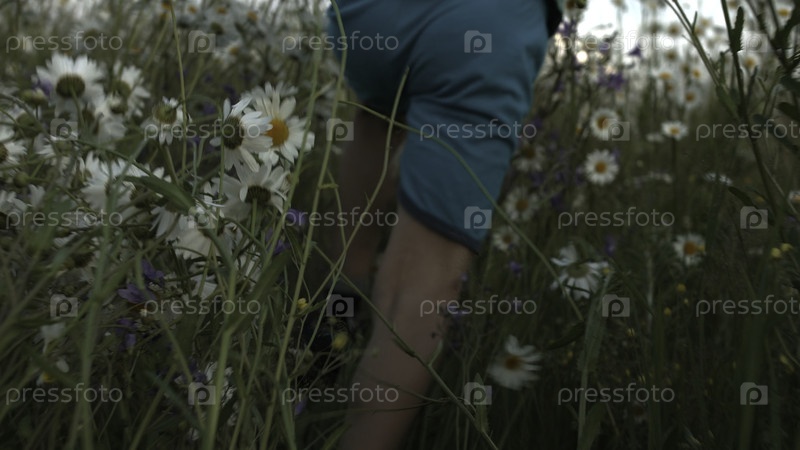 Мальчик, бегущий по летнему поляну.Креативно.Молодой ребенок в летней одежде бегает через ромашковые кустарники.Высококачественный персонал FullHD