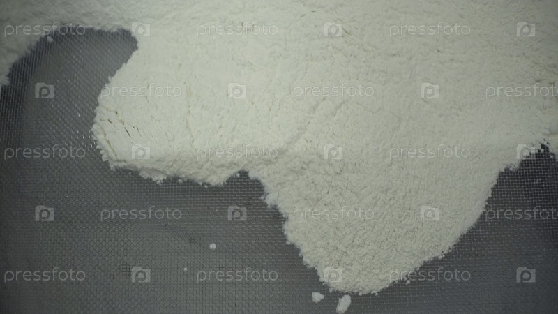 Белую муку просеивают через большое сито. Клип. Мука, падающая сквозь сито, концепция приготовления пищи