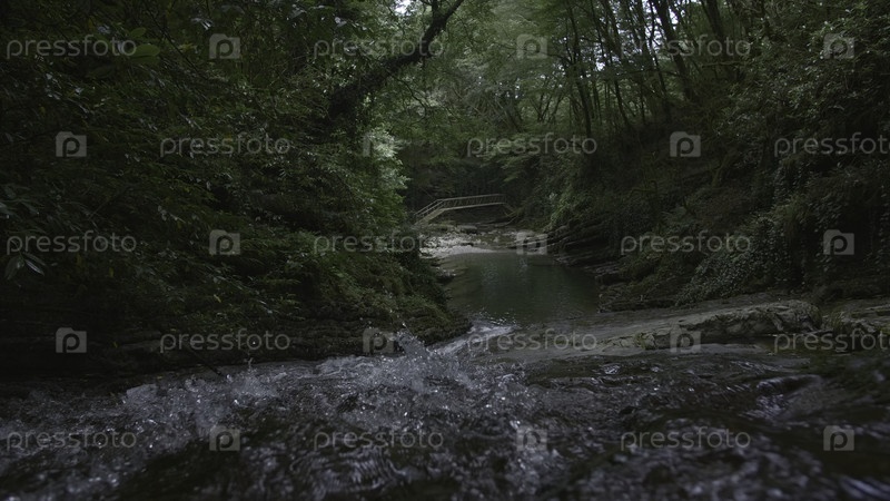 Красивые ручьи лесной реки летом. Творческая. Река протекает в густом зеленом лесу с пышной растительностью. Быстрая река течет среди темно-зеленых джунглей