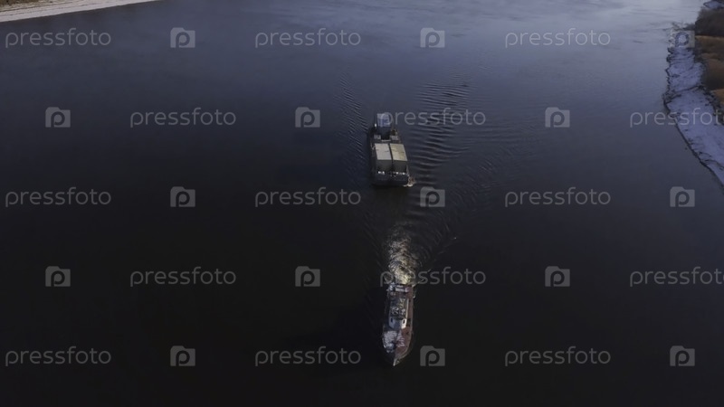 Вид лодки с грузом, плавающей на реке. Прекрасный пейзаж с грузовым судном, плывущим по реке. Доставка товаров на лодке с прицепом. Перевозки
