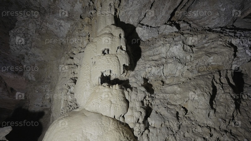 Подземные пещерные образования из сталактитов и сталагмитов.Продолжайте.Вид внутрь пещеры на гигантских каменных стенах