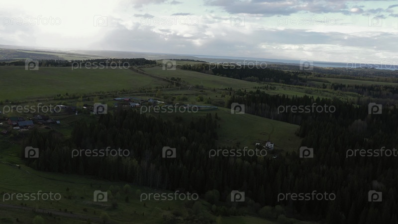 Вид на деревню в поле с лесом на горизонте летом. Клип. Небольшая деревушка в зеленом поле в пасмурный день. Деревня среди полей и зелёных лесов