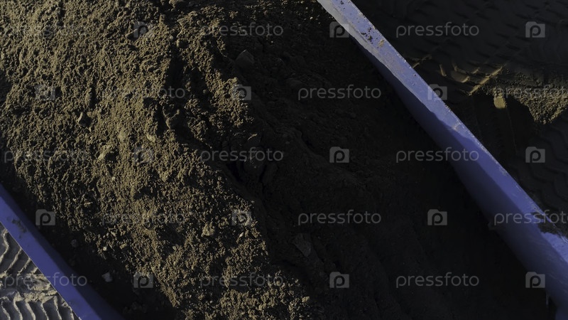 Сцена. Вид на самосвалы с землей на стройплощадке Строительная площадка или карьер с самосвалами, полными земель