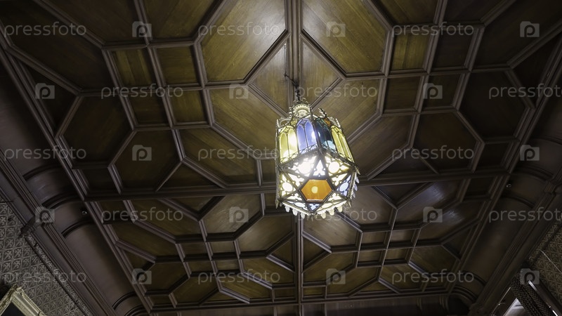 Ниже представлен вид на красивый деревянный старомодный потолок с висящей люстру из витража. Продолжайте. Детали ретро-стилизованного помещения или музея