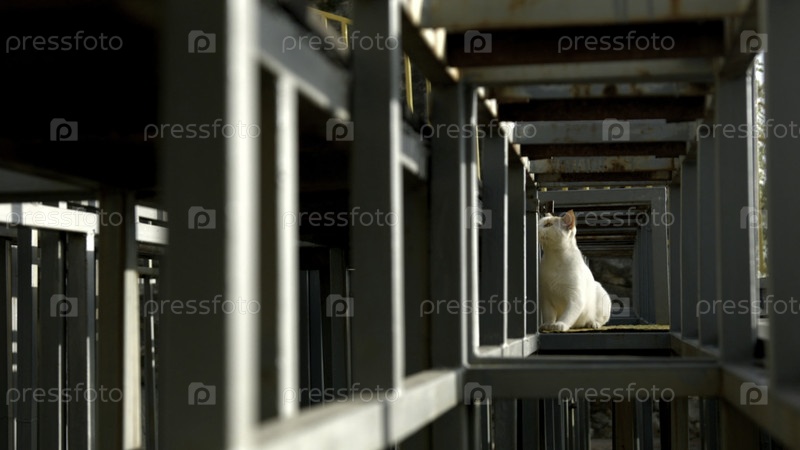 Ржавое здание с котом на солнце.Креативность.Животное на стройке