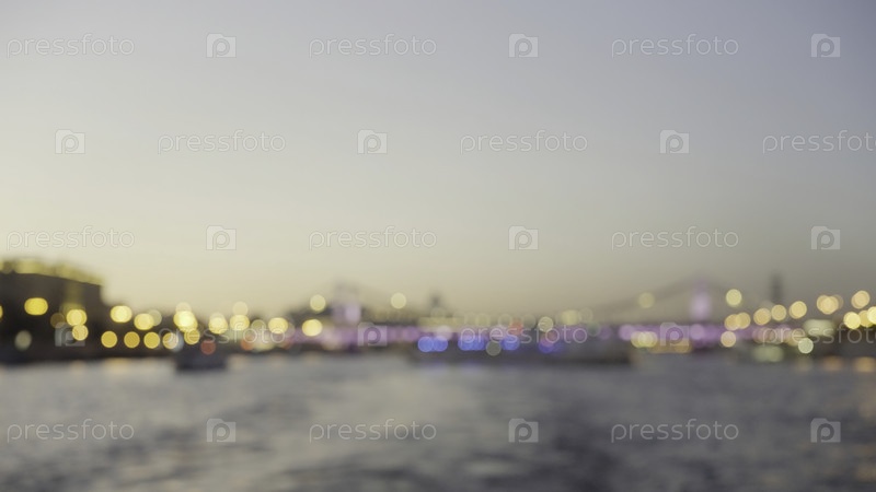 Размытый красивый пейзаж захода солнца с мостом и огнями. продолжайте. фонарики боке украшают мост над волнами реки