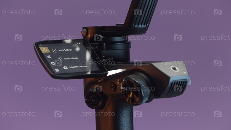 Большой вращающийся штатив, к которому прикреплена большая видеокамера, снимает в разных направлениях на ярко-фиолетовом фоне