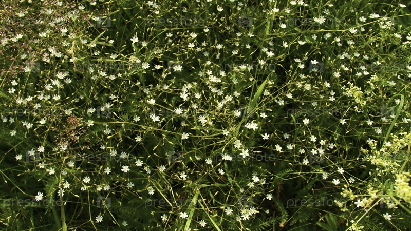 Густая зеленая трава с цветами летом. креативность. погружение в зелёную траву на летнем лугу. много маленьких цветов в густой зеленой траве
