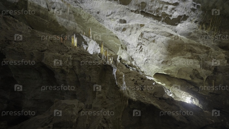 Подземные пещерные образования из сталактитов и сталагмитов.Продолжайте.Вид внутрь пещеры на гигантских каменных стенах