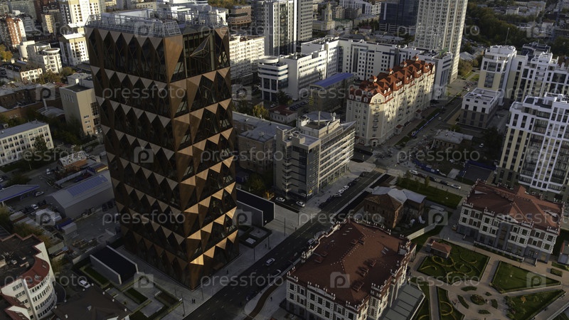 Вид сверху современного дизайна здания на фоне города. Резервные кадры. Современный город с красивой архитектурой и современными бизнес-зданиями. Золотое издание с офисами на заднем плане города летом