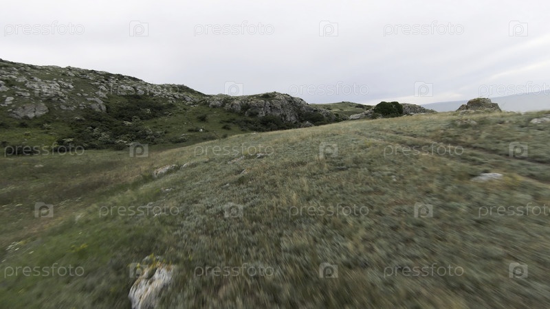 Летающий дрон над горными склонами.Пойдем дальше.Красивый полет над зелеными склонами с камнями.Вид на холмы и горы летом