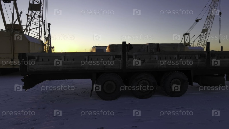 Грузовик в морском порту зимой. Клип. Разгрузка на грузовике в морском порту. Грузовик для разгрузки контейнеров с судна зимой
