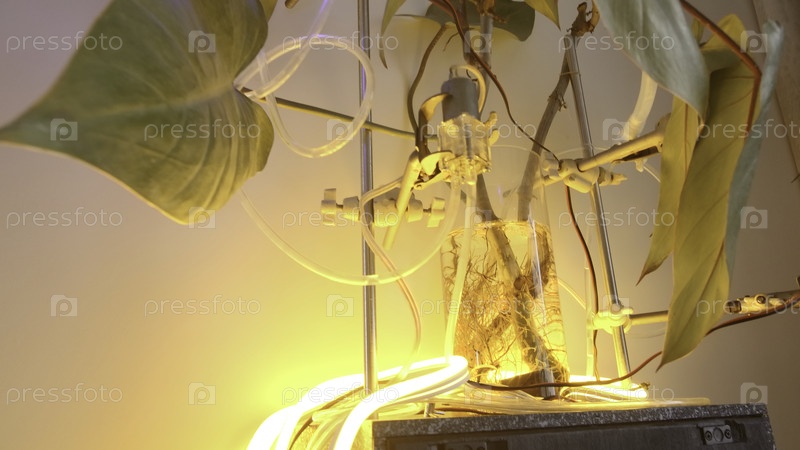 Закрытие воды и света к домашнему растению.Креативное.Искусственная футуристическая установка для домашнего цветка.Искусственный свет и вода, чтобы накормить домашние растения