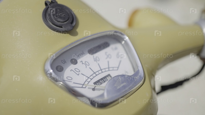 Скорость мопеда. Продолжайте. Детали стильного ретро-мопеда. Панель скорости на европейском мопеде. Бар инструментов на скутере или мотоцикле