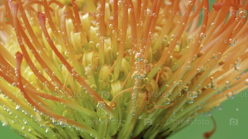 Красивый цветок с подводными штаммами. Резервные кадры. Экзотический яркий цветок под водой с пузырями. Красивые цветочные stamens в чистой воде с пузырьками. Освежающая вода с протеином