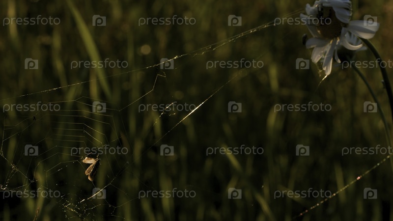 Пауки плетут паутину на цветах.Креативные.Маленькие насекомые, которые делают почти прозрачные сети вокруг цветов в траве.Высококачественный персонал FullHD