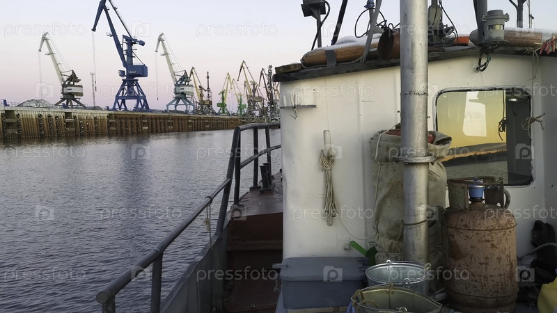 Вид с лодки на морской порт. Клип. Рыболовные или грузовые суда отправляются в промышленный порт. Морской бизнес, судоходство и рыболовство