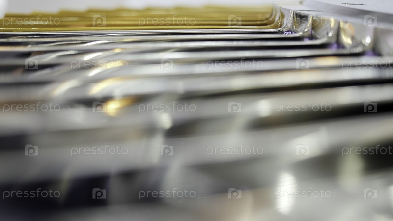 Металлические размытые параллельные полосы с мигающими маленькими лампочками закрыты. СМИ. Промышленный фон с деталями машины
