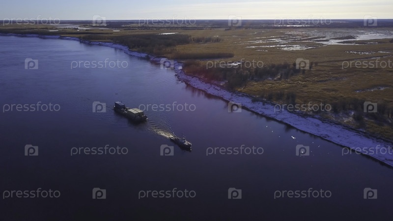 Вид с воздуха судоходной баржи, перевозящей грузы вверх по реке. Клип. Полет над широкой рекой с кораблем и баржей