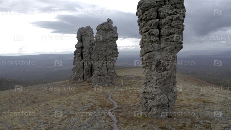 Вид на каменные столбы на горе.Каменные столбы на горе в пасмурный день.Пейзаж с загадочными каменными столбами на горе