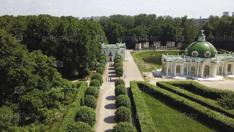 Парковая переулок с дворцом летом. творческий. вид на туристов, гуляющих по парку дворца. туристы в зеленом парке во дворе в солнечный летний день