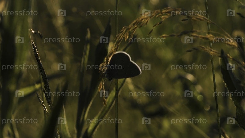 Бабочка сидит на раскачивающейся траве.Креативно.Бабочка на кончике колючей травы.Прекрасная бабочка в траве в солнечный день