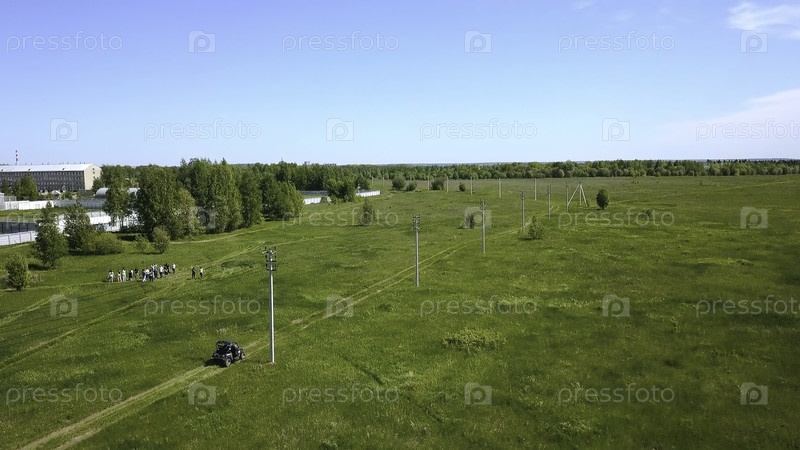 Автомобиль едет по сельской дороге в солнечный летний день. Клип. Летом автомобиль движется по полевой дороге на зеленом поле. Полевая дорога с автомобилем со зелёной травой в солнечный день