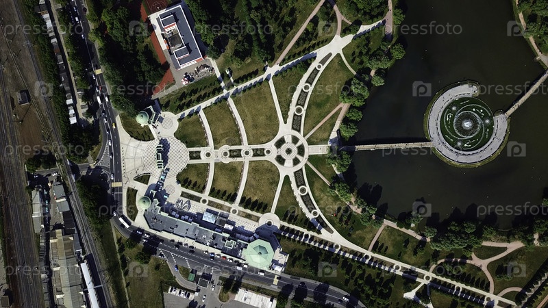 Верхний вид из воздуха городского парка с круглым прудом.Креативный.Летний парк с небольшими дорожками и зелеными деревьями