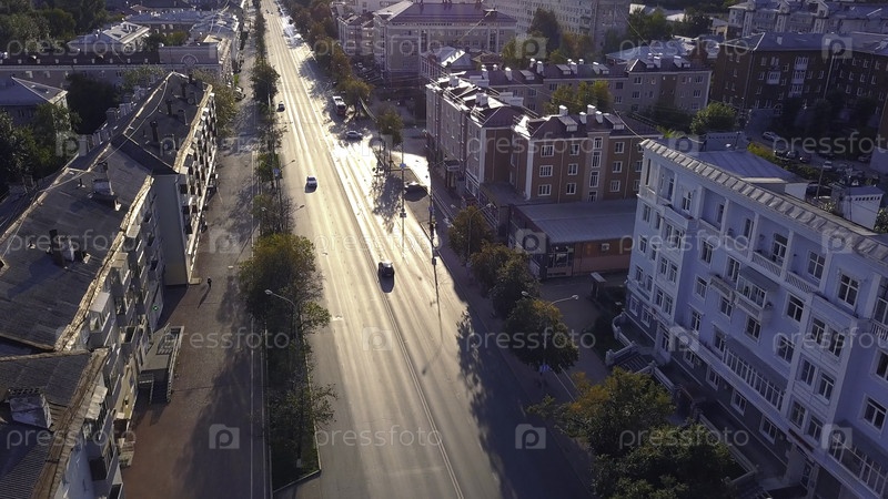 Летающий вдоль зеленых деревьев во время заката, современный городской пейзаж. Клип. Городская улица с домами и движущимися автомобилями