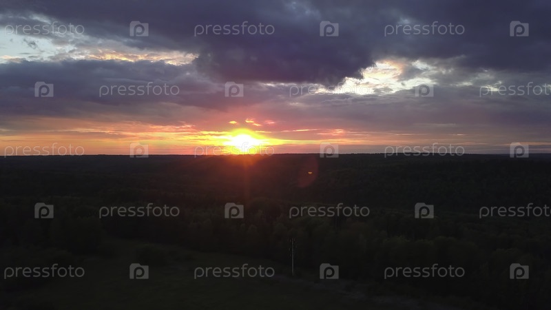 Вид на красивый закат на горизонте с лесом. Клип. Красное солнце с облаками и лес на горизонте. Темный густой лес с красным закатом на горизонте