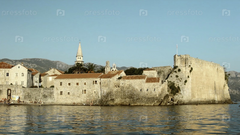 Летний вид с голубым небом и старым городом с церковью и башней с морскими волнами.Креативно.Прекрасная природа и архитектура