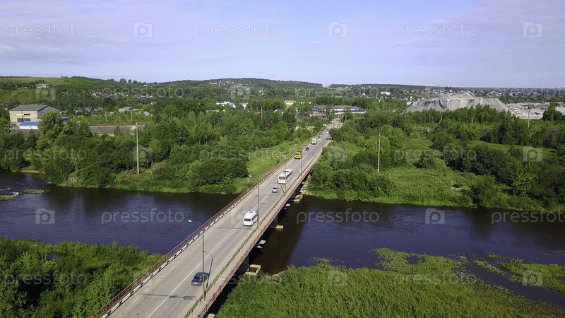 Вид с воздуха на мост с движущимися автомобилями через реку и зеленой природой.Концепция транспорта, мост в сельской местности в солнечный летний день