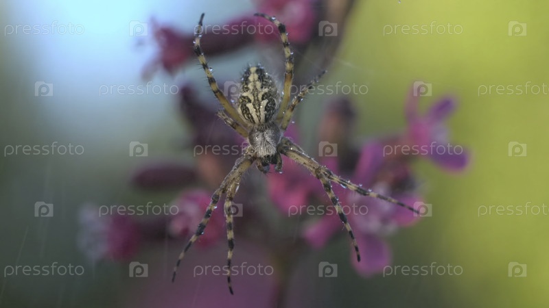 Инсект в дожде.Креативно.Интересный красочный паук, сидящий на паутине с каплями воды и за которой следует дождь, падающий на него, цветы и паутины